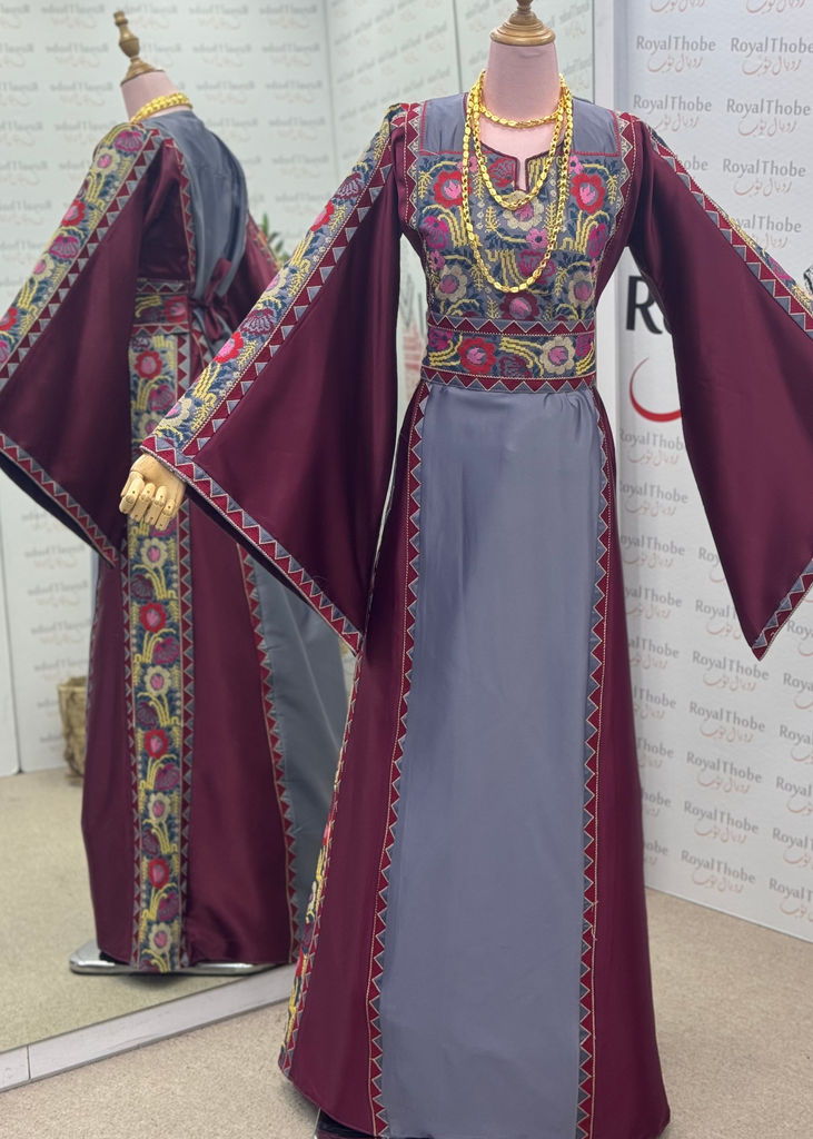 - Our Newest Gray/Burgundy Simple Floral Satin Long Full Embroidered Thobe/Dress.