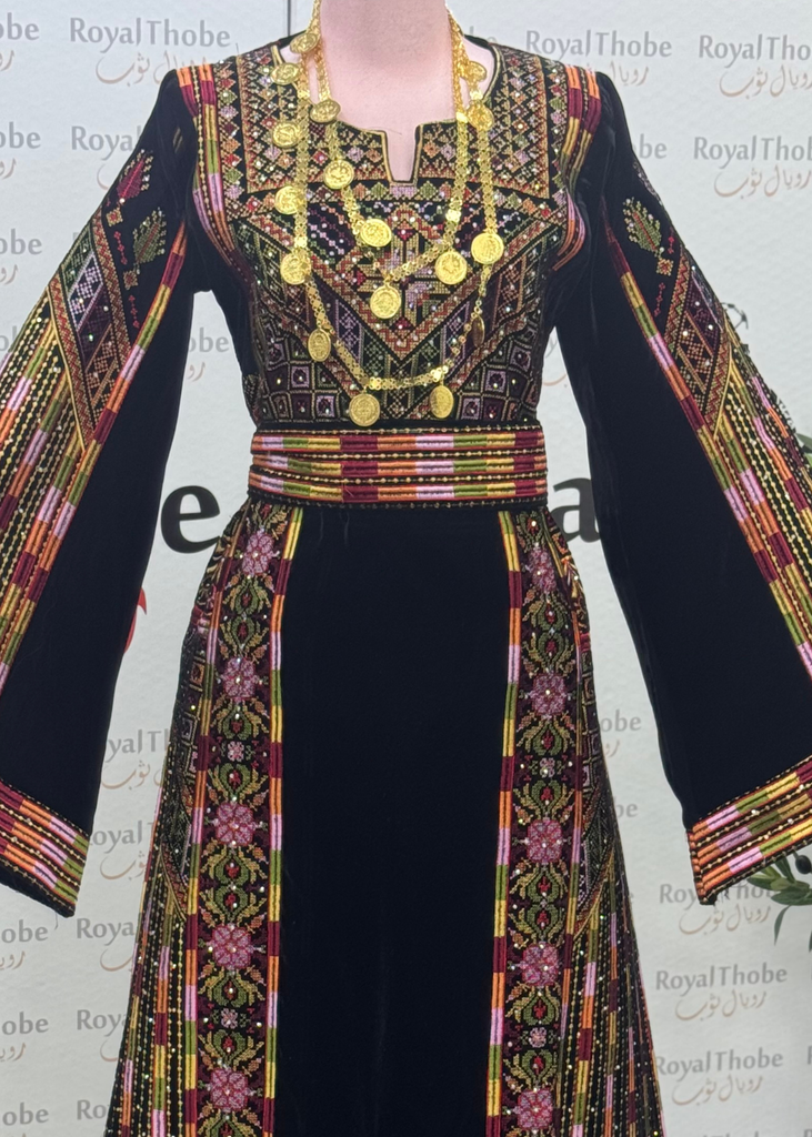 - Our Newest Velvet Black Manajel Long Full Embroidered Thobe.