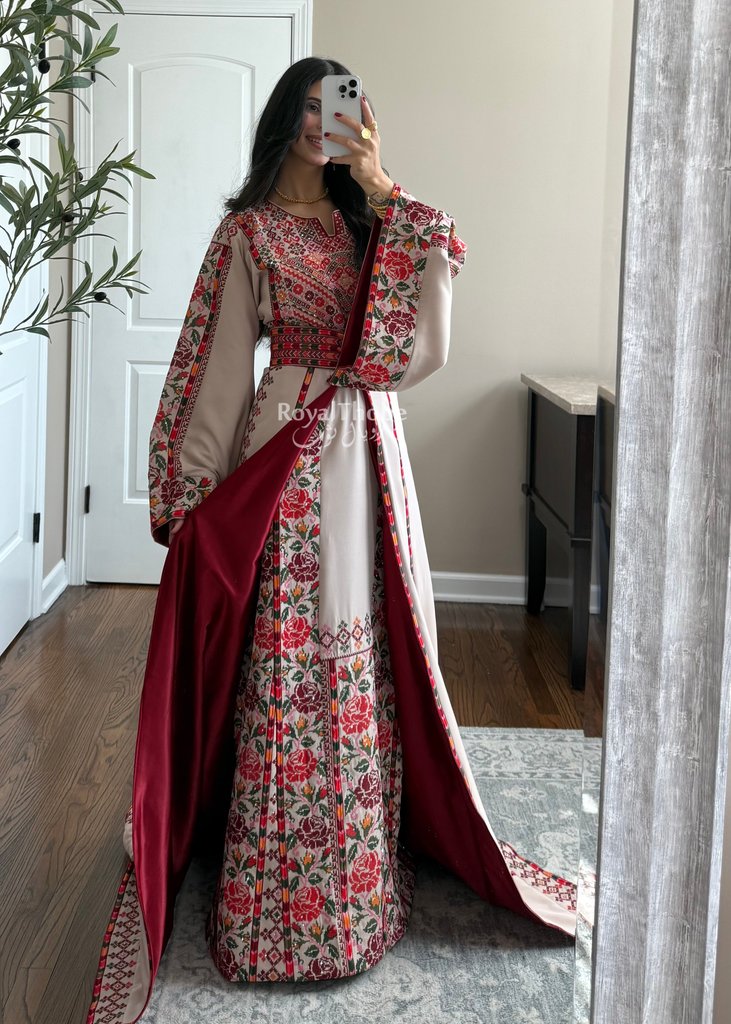 Bridal Beige/Burgundy Warda Full Embroidered Thobe