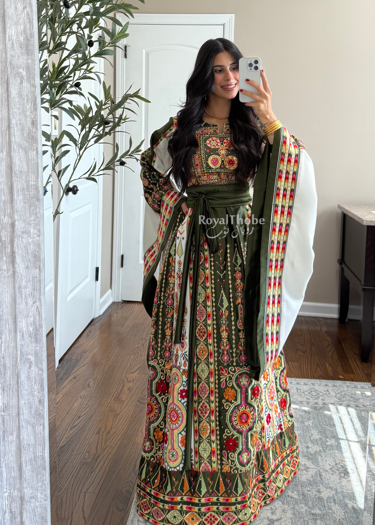 New Collection Olive Green/White Satin Maleka Full Embroidered Thobe.