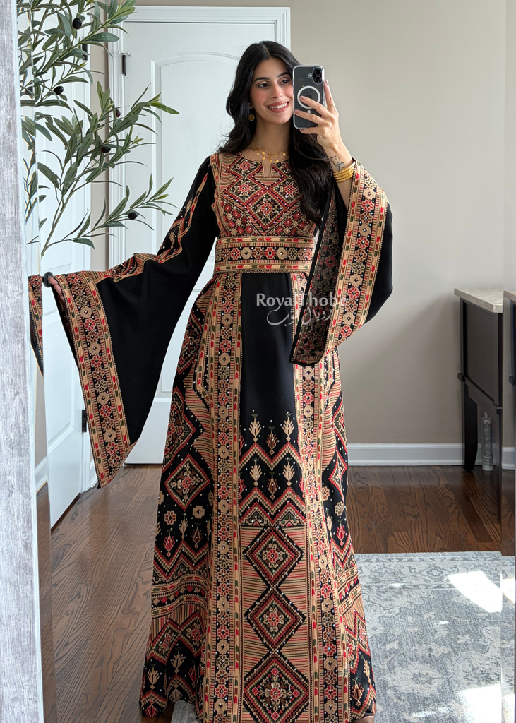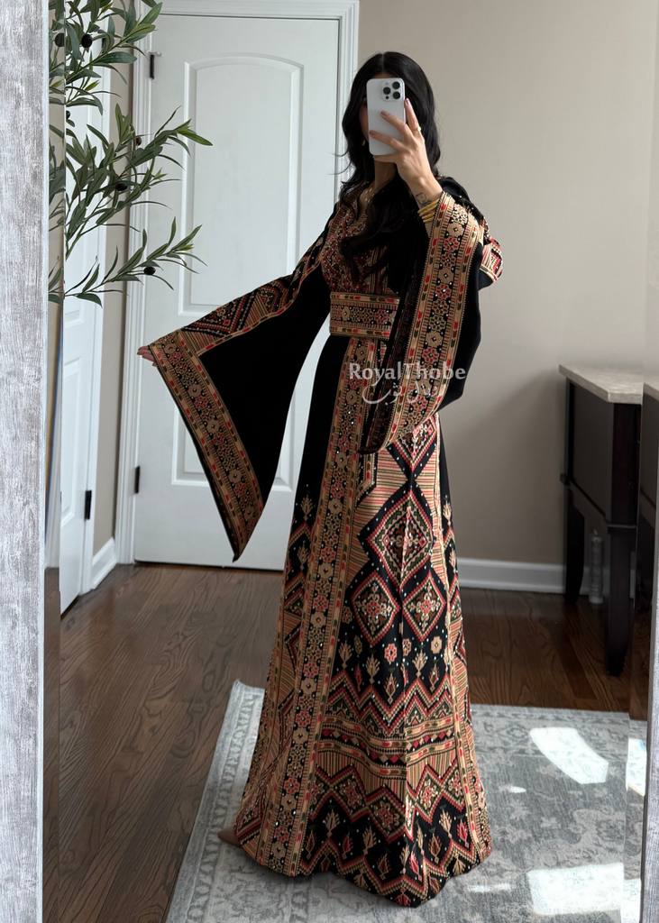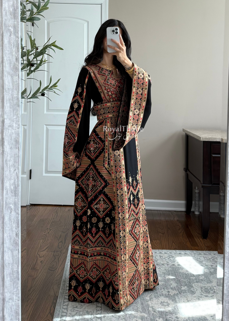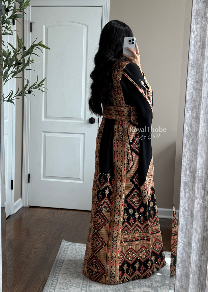 Black//Gold Dimond Long Full Embroidered Linen Fabric Thobe