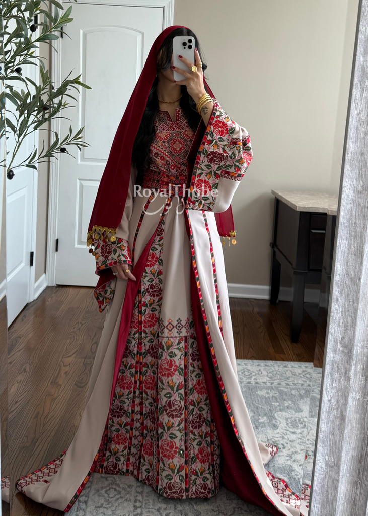 - NEW Collection Bridal Beige/Burgundy Warda Full Embroidered Thobe.