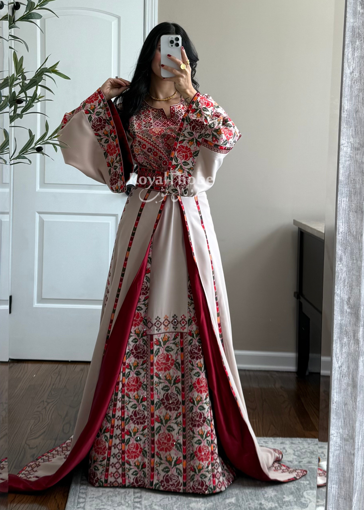 Bridal Beige/Burgundy Warda Full Embroidered Thobe