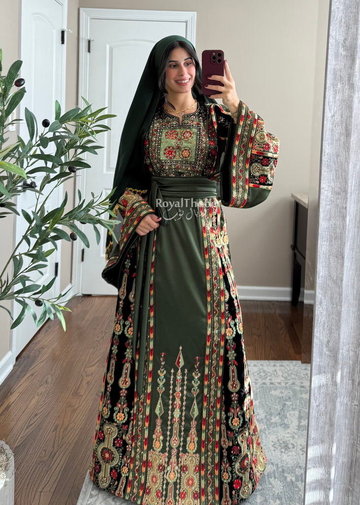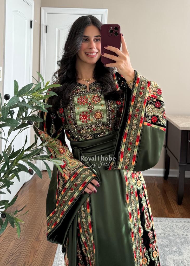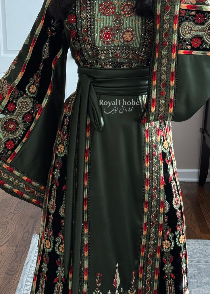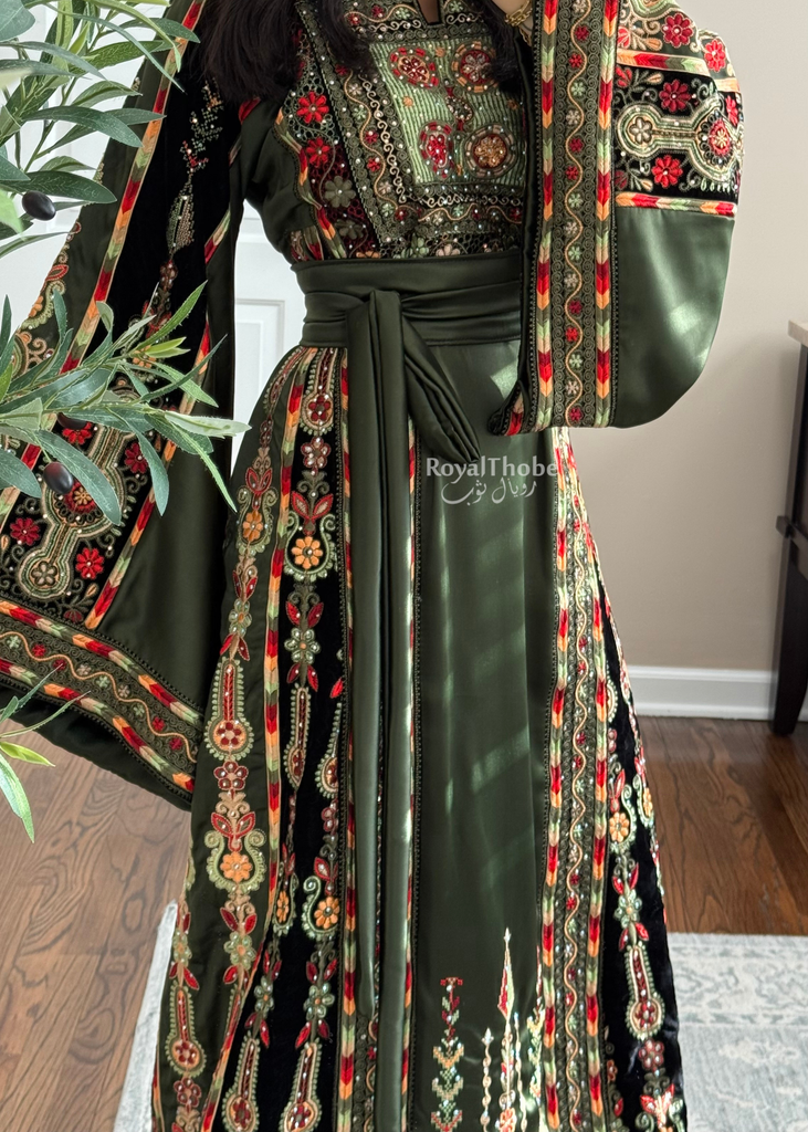 Olive Green Satin & Black Velvet Maleka Fully Embroidered Thobe