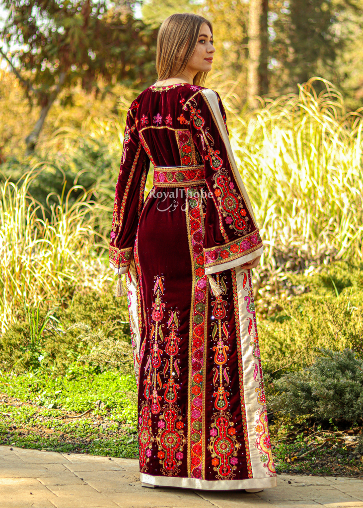 New Palestinian/Jordanian Velvet Burgundy Modern Maleka With Suede Beige Long Full Embroidered Thobe.